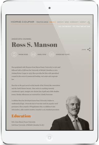 The site navigation easily leads users to the various areas of practice and then pairs that content with the specific lawyers who specialize in these areas. Page content throughout the site is stand alone and shareable – which allows our digital marketing program for Horne Coupar to target specific areas of practice, specific lawyers, and unique articles relevant to all of the above.